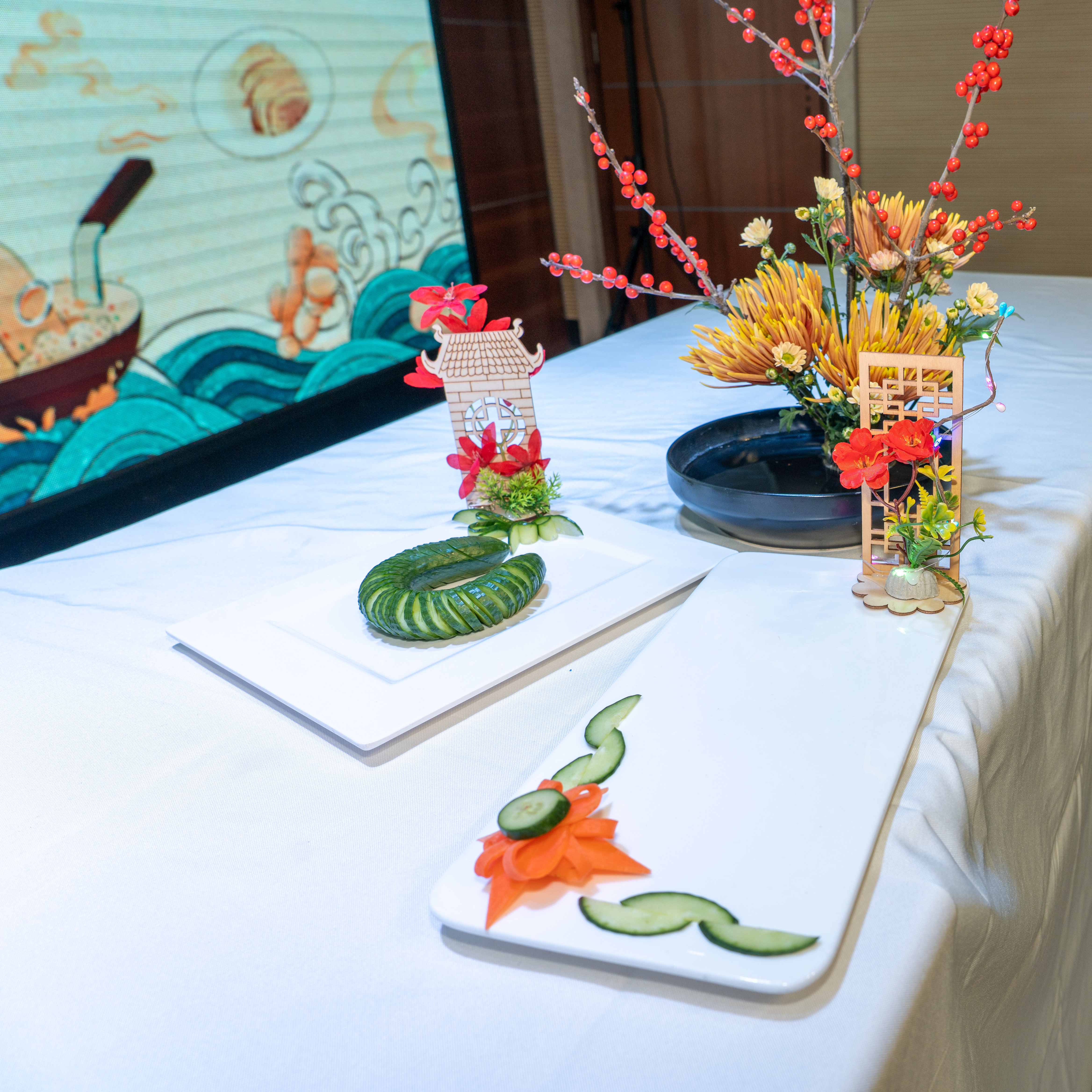 邓宇兵老师讲座从三个内容进行展开,首先,他以自身的学习和工作经历为例,从菜肴制作的工艺讲起,深入浅出对工匠精神进行解读,他指出成为一名真正的工匠,需要具备三点:工匠之道、工匠之术和工匠之行,树立正确的工作观,用对方法创造价值,在行动中体悟修行的乐趣。其次,他讲到粤菜师傅工程的背景,倾心分享自己的烹饪之路,鼓励同学们要学好专业知识,不断提升职业技能,创造性地劳动,开拓自己的职业平台。最后,邓宇兵老师向同学们展示了精湛的刀功技巧,蒙眼切蓑衣黄瓜、气球上切菜、大刀雕花和盘饰技巧,一边展示一边耐心讲解细节。