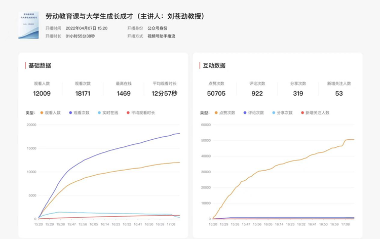 此次讲座受到了热烈反响,线上观看人数1.2万人,点赞量5万,分享319次,创下了我校最高在线人数的听课纪录。线上线下同步直播的讲课形式,使得传统素质课堂讲起来、活起来、新起来,是我校在教育课程改革的一次创新,也是五育并举、博雅育人的课堂方案优质样本,为继续构建我校“书院+课程+基地”的特色劳动教育育人体系做出了有效的探索与实践。
