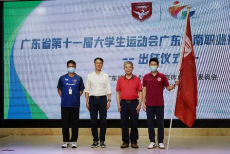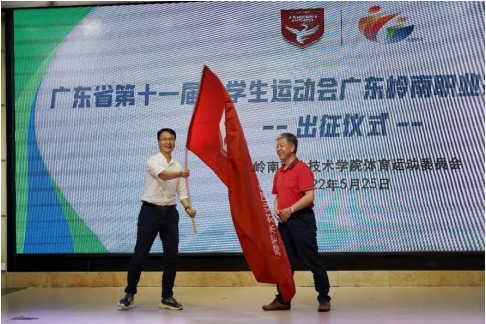 党委书记柴克生向代表团团长卜佳锐授予出征旗岭南运动代表团出征广东省第十一届大学生运动会的号角已经吹响,我校将服从组委安排、追求卓越、重在精神,不骄不馁、文明守纪,顽强拼搏、永不言弃,以实际行动展示岭南人的精神。