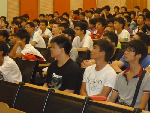 听课的主角,纷纷来自不同学院不同专业的莘莘学子,他们的好奇,他们的朝气,他们对大学课堂的渴望,使得短短的45分钟课堂充满生机。当任课教师说到李双江之子引发的家庭教育之思,当大屏幕上出现新生入学几百名家长集体睡地板的感人图片,当食品安全问题成为学生们课堂上的共鸣,有多少学生点头喊出“学习《弟子规》真的很有用”,已经不言而喻。