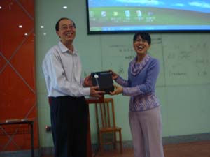 讲座最后,大学语文与国学教研室陈淑仪主任向梁谦义主任赠送了礼品,并带领现场教师及部分同学与其合影留念。