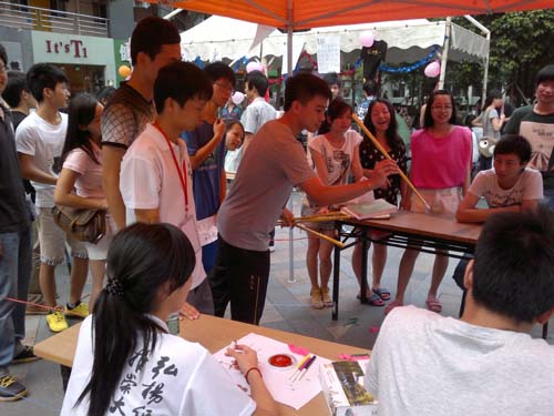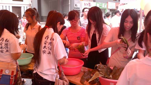 2012年6月14日星期四下午,由博雅教育学院主办《粽飘香 舞端阳 忆屈原 话重五》大型节日主题活动在岭南学院风情街盛大举行。本活动由国学社承办,书法协会/极光文学社/B-BOX等协会联手协办,阵容十分坚强。天气虽然炎热,各协会的负责人早早就投入活动的准备中,搬桌椅,协调位置,写标语,挂彩纸,每项工作都在汗滴浸染下井然有序地进行着。国学社的一位女孩子,齐齐的刘海被汗水浸得一绺一绺的,晒黑的皮肤上挤出一道灿烂的笑容,在交流动人的瞬间中,她说:“老师,准备今天的活动,我们今天都还没来得及吃饭呢!”