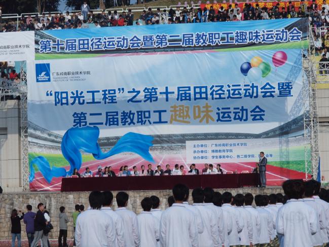 2010年12月4日,“阳光工程”之第十届田径运动会暨第二届教职工趣味运动会在岭南学院运动场隆重举行,出席开幕式的领导有集团副总裁关婉勤、党委书记丁纪平研究员、李峻副校长、郧建国副校长、杜文宇副校长、程翠英副校长、朱敏副校长、总裁判长潘博文,以及各二级学院和职能部门领导。