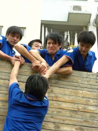 下午1:50,更艰巨的任务接踵而来。首先是 “解手链”的活动,将8小组分成了4大组,20多人把手交叉握着并最后得解开成圆圈,看似简单,但有些队员的手却纠缠在一起。接下来的“南水北调”很能体现一个团队的合作精神,一轮下来,桶里的水没多少,洒在路上的水却是一滩又一滩的。最后也是最关键的一个环节:翻越毕业墙。一面4.2米高的墙,80多个人,没有任何道具,顾名思义,只要翻过那墙,我们就可以顺利毕业。结果是让人兴奋的,但过程却是艰辛的。在很多人眼中,这根本是不可能完成的事情,但我们却做到了。男生们坚厚的肩膀和强烈的责任心,把自己的潜能完全激发出来。最终在只有一个指挥发言而其他队员不能发出任何声音的情况下,他们漂亮地完成了,用时仅仅是30分钟。