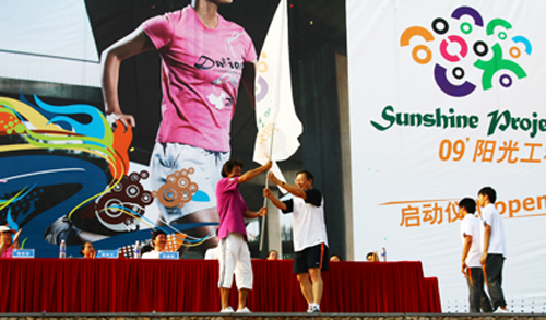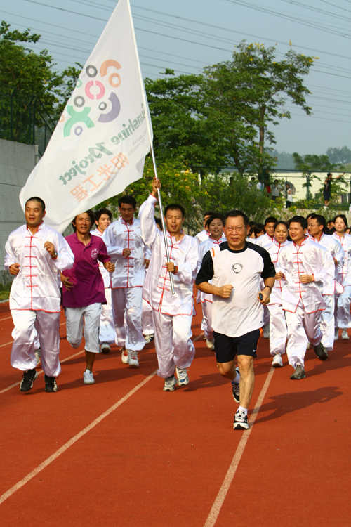 仪式最后由俞院长亲自授旗,博雅教育学院体育教研室主任骆刚接过“阳光工程”大旗,千人长跑活动正式开始。