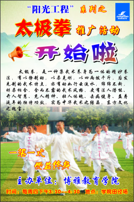 继“阳光工程”冬季长跑之后太极拳的全面推广 来源: 发布时间:2009-12-23 00:00:00 浏览次数: 次 【字体:小 大】 继10月22日“阳光工程”启动以来,全院冬季长跑每周都在连续进行。经过两个月的工作,每天锻炼一小时已经深入人心。 随着校运会千人太极的表演,太极已深受全体师生的喜爱,从12月17日开始,每周四下午三点半,博雅教育学院体育教研室面向全院进行太极拳推广,随到随学。 分享到: 【打印正文】