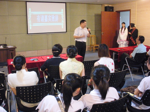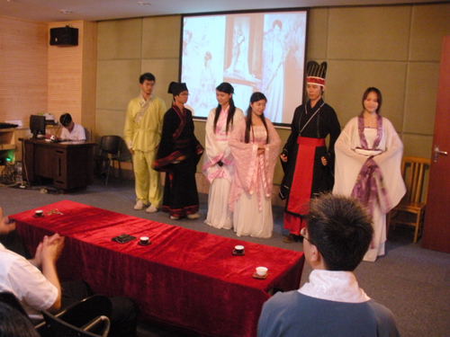 大会在悠扬的轻音乐中拉开序幕,三个身穿民族服装的女同学娴熟地为大家表演了中国传统茶艺,并简单介绍了茶文化的发展。