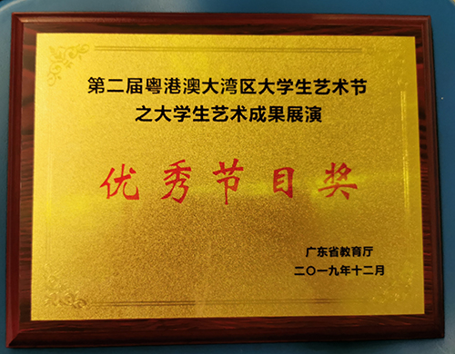 美育中心通过公共课程的普及,培育了一批具有较高艺术水准的作品。在2019年12月21-22日广东省教育厅、“粤港澳大湾区音乐教育与艺术发展联盟”举办的第二届粤港澳大湾区大学生艺术节艺术成果展演中,美育中心选送的学生舞蹈作品《沁园春•雪》荣获舞蹈类优秀节目奖,同学们以舞蹈的形式表达了青年学子对祖国的依恋、对光明的追求,抒发了革命者伟大的爱国主义抱负和豪迈的胸怀。