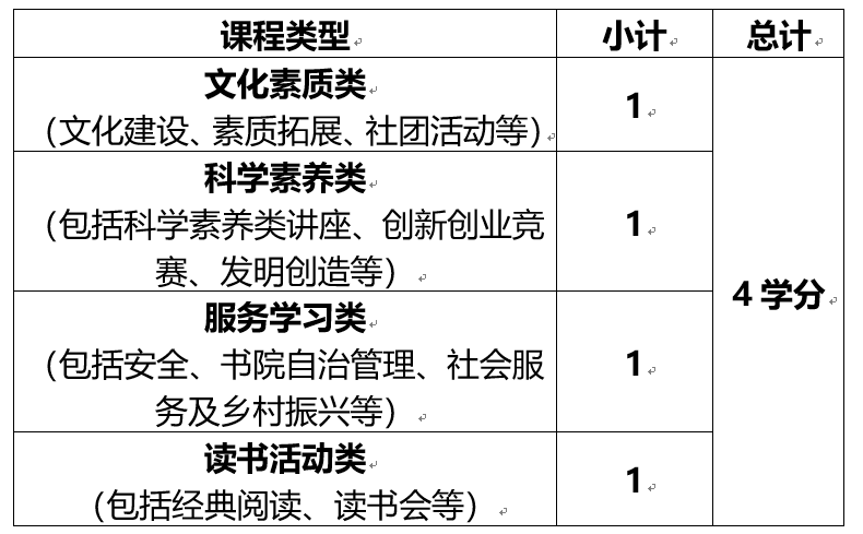 第四条 博雅素质分类选项课主要分为文化素养类、科学素养类、服务学习类和读书活动类四大类课程,四大类课程的内容及学分配比标准如下:
