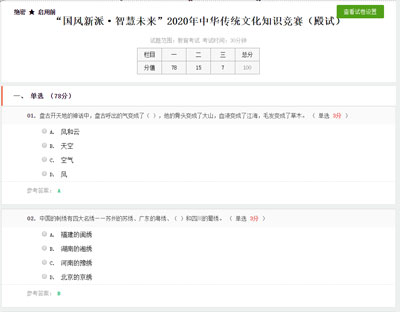 为更深入贯彻落实学校疫情防控期间开展线上教学活动工作等相关文件精神,深化高校文化育人功能,树立我院师生高度的文化自信,营造传承和弘扬中华优秀传统文化的浓厚氛围。我校面向全体师生开展了2020年“国风新派·智慧未来”中华传统文化线上知识大赛。