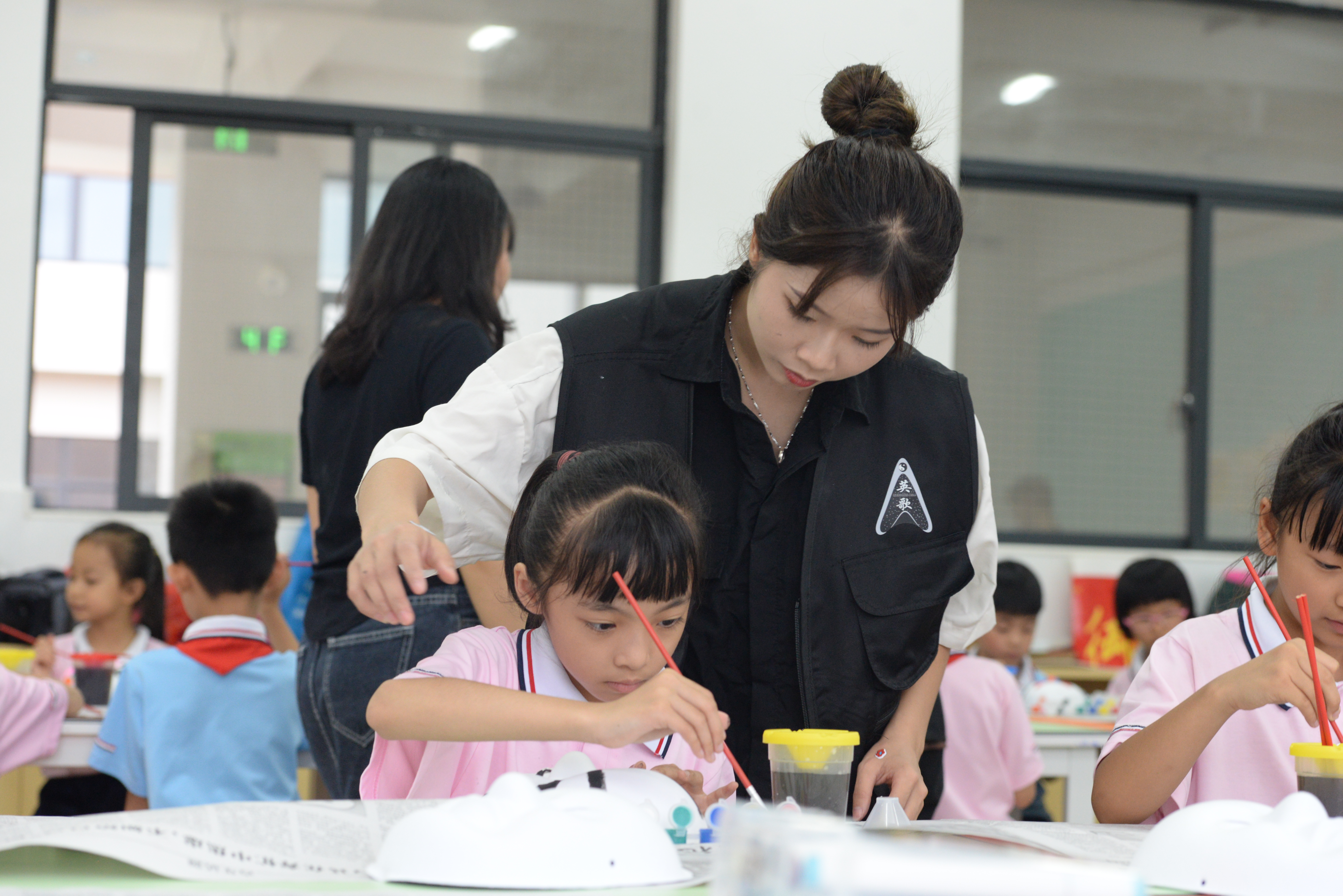 演出结束后,项目组的助教们带领孩子们进行了英歌脸谱的绘制体验,经过各位哥哥姐姐生动的讲解和仔细的示范,孩子们认识了英歌脸谱的历史渊源,学会了识别脸谱的类型,还纷纷动手制作了自己的专属脸谱,一张张色彩鲜艳、形象夸张的脸谱,在孩子们的笔下应运而生。孩子们饶有兴趣地动手操作,并不时与助教们交流互动:“刚刚我画了个脸谱,还在脸上戴了一下,真的太有意思了!”清飞小学一年级学生周廷锴说。