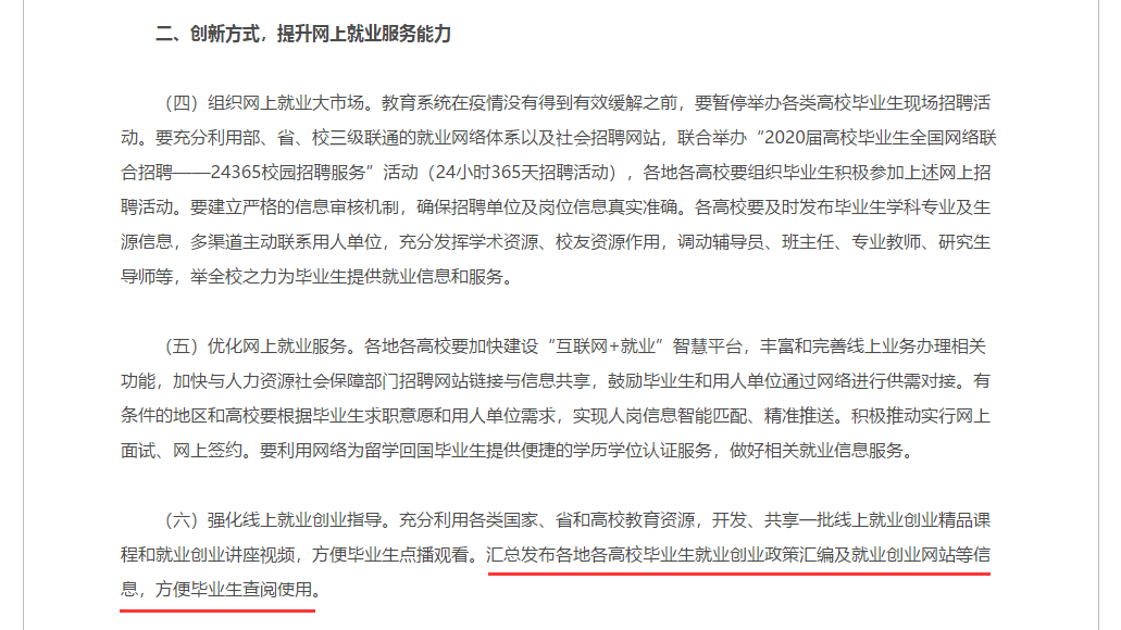 在通知第(六)点中明确提出:强化线上就业创业指导。汇总发布各地各高校毕业生就业创业政策汇编及就业创业网站等信息,方便毕业生查阅使用。