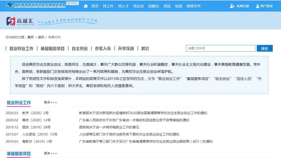 为了贯彻教育部的要求,让广大高校毕业生更便捷地查找政策、了解政策、用好政策,广东省高等学校毕业生就业促进会官方网站“高就汇”(http://www.gradjob.org)专门开辟了“政策文件”栏目,收集和汇总近年来与大学生就业创业密切相关的重要政策文件。