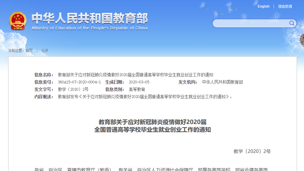 2020年3月,教育部下发了《关于应对新冠肺炎疫情做好2020届全国普通高等学校毕业生就业创业工作的通知》(教学〔2020〕2号)。