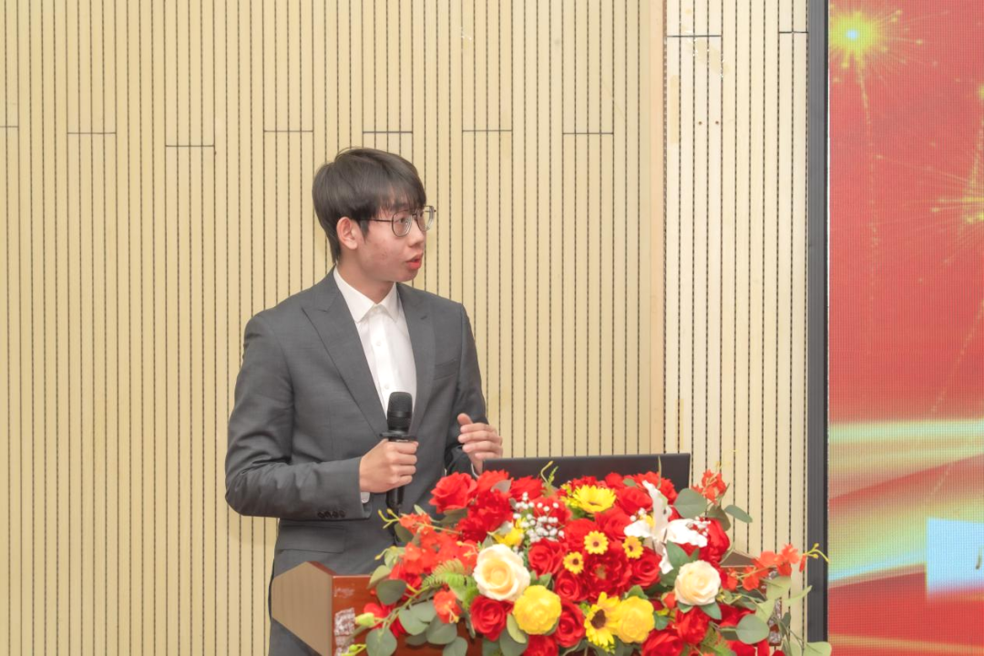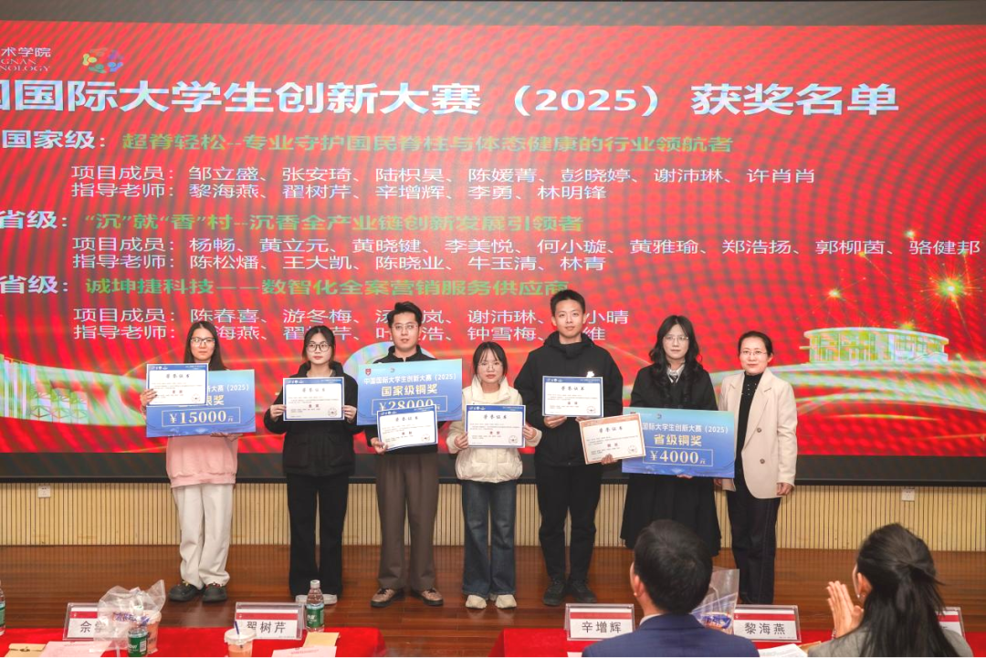 在表彰环节,大会依次对本年度在双创教育工作中表现突出的先进集体、优秀指导教师、双创先锋个人等典型代表进行隆重表彰,并颁发荣誉证书与奖牌。随后,国家级铜奖项目“超脊轻松——专业守护国民脊柱与体态健康的行业领航者”负责人邹立盛,以项目路演的形式生动展示了产品创新亮点、市场应用前景及社会价值,精彩分享了参赛过程中团队协作、难题突破、经验沉淀的宝贵经历,其“以创新服务民生”的创业理念赢得了现场阵阵掌声。