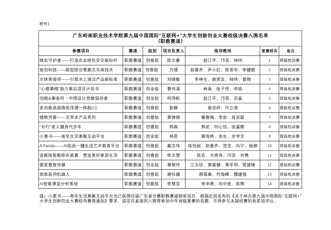 附件:第九届中国国际“互联网+”大学生创新创业大赛校级决赛入围项目名单