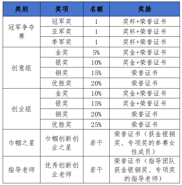 以第五届广东女大学生创新创业大赛官方所设立奖项及奖励为准,校内阶段不另设奖项及奖励。