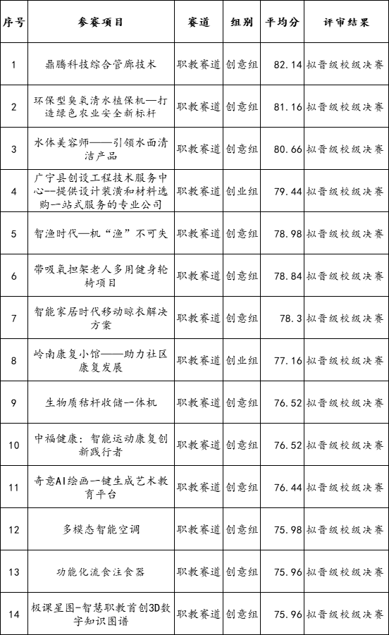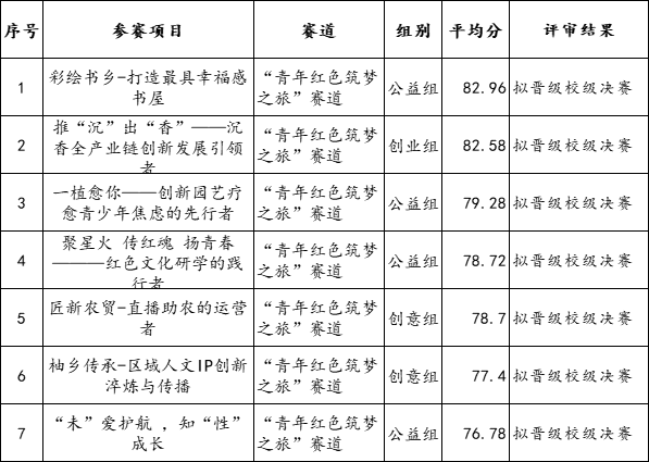 为确保大赛评审公平、公正、公开,校赛组委会邀请校内外高校评委、往届省级赛事评委组成5人评委专家组,参照往届省级复赛网评模式,对校复赛参评项目进行认真评审。校赛组委会根据评委专家组评审结果,最终评选出14个职教赛道项目和7个“青年红色筑梦之旅”赛道项目入围今年的校级决赛。