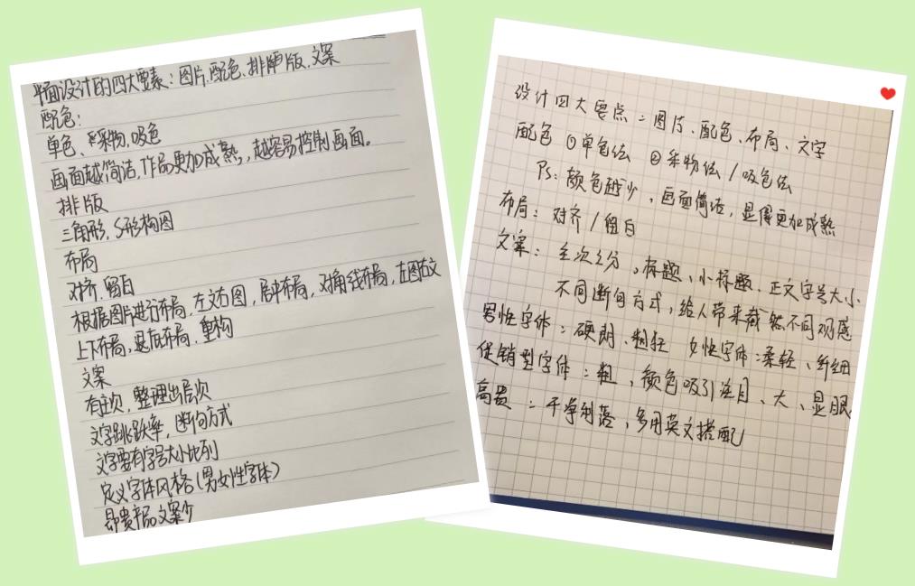 相信在专业老师的教导下,许多同学们会发现,做海报变得轻而易举了,独乐乐不如众乐乐,在这有知识有温度的课堂中,同学们刻录下知识的笔记,快来一起 pick,你心中优秀课堂笔记吧。