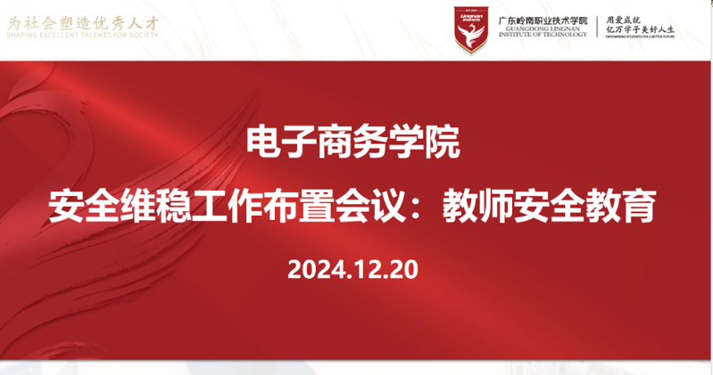 安全是学校得以稳定发展的基石,为加强教师安全防范意识,12月20日晚,我院线上召开安全维稳工作会议,学院全体教师参会,会议由吴琳副院长主持。
