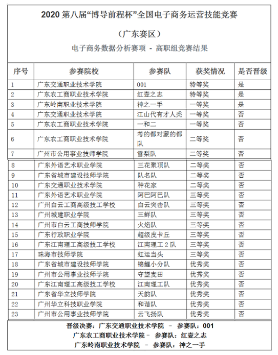 2020年12月4日,为提升高等职业院校电子商务专业教学质量,由全国电子商务运营技能竞赛组委会主办、北京博导前程信息技术股份有限公司承办的第八届“博导前程杯”全国电子商务运营技能竞赛省区赛落幕。我校电子商务学院出战全国电子商务运营技能竞赛,与省内20余所院校同台竞技,我校杨佩江、李俊勇、彭皓组成的队伍在此次竞赛电商数据分析赛项-高职组荣获一等奖,队伍指导教师黄嘉健、黄红辉荣获优秀指导教师,同时队伍晋级全国决赛。