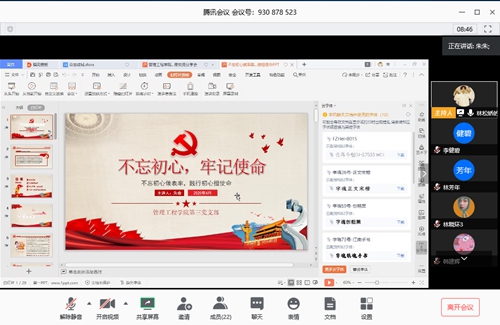 4月9日晚,管理工程学院第三党支部在腾讯会议上召开“不忘初心做表率,践行初心担使命”支部书记讲党课,参与本次会议的人员有支部书记朱青,支部委员林松娇、李健碧,教师党员陈婷、谭永念、邹紫辉、钟磊、卢天瑶、陈维康以及14名学生党员。