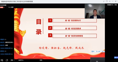 4月15日,智能制造学院党总支第三党支部刘天贵书记以线上直播方式讲授党课,勉励思诚书院的教师和学生党员,做到践行“初心使命”,疫情在前,党员先行。