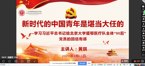 4月13日,智能制造学院党总支第四党支部在线上组织开展了“守初心、担使命、敢担当——争做“战疫”防控下的合格共产党员”主题党课,支部党员均准时到达腾讯会议app线上课堂。
