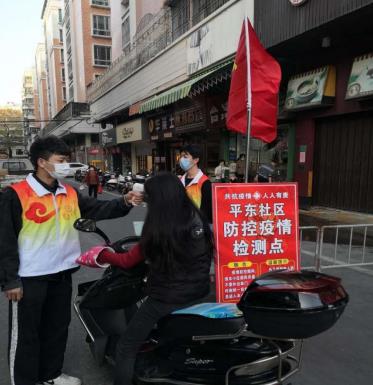 在平东肖华松慈善基金会党支部组织平东大学生志愿者参与社区预防新型冠状病毒疫情防疫宣传活动,蔡国证同学志愿积极参与,对来往人员进行体温检测,以及外来车辆登记。