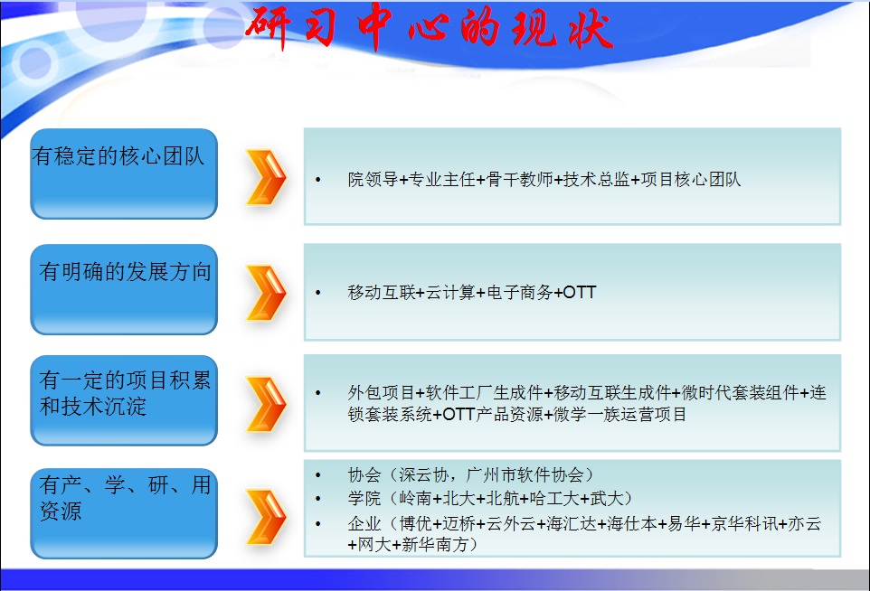该中心按照软件公司的流程和开发要求在积极实施工程化实践教学模式,并且已经沉淀和积累了具有敏捷软件开发模式的软件工程化实施方案(7天软件工程化实施规范);同时工作室依托学校以及深圳和广州的企业资源,并和深圳云计算产业协会的等相关社团组织资源建立紧密合作关系,并组织学生团队为云计算协会开发综合云计算服务平台,这些真实项目的开发为中心积累了一套基于软件工厂的可重用中间件平台。
