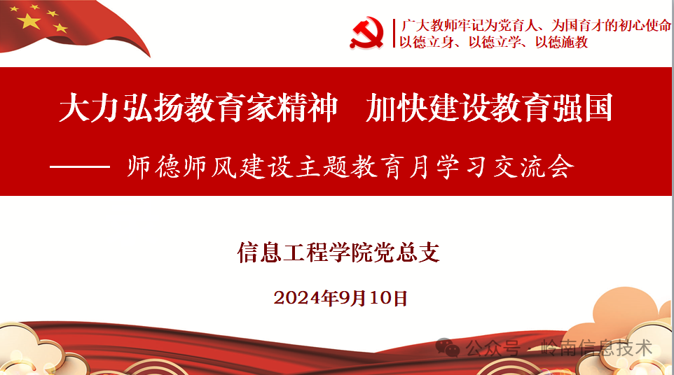 为深入贯彻党的教育方针,落实习近平总书记关于教育的重要论述,全面加强新时代教师队伍建设,提升教师的师德水平和业务能力,近日,信息工程学院党总支积极开展了以“大力弘扬教育家精神,加快建设教育强国”为主题的师德师风建设主题教育月学习交流会。交流会由党总支余生书记主持,全体教职工参加会议。