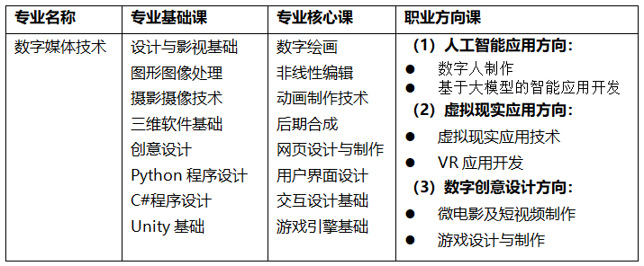 数字媒体技术专业课程体系以技术为主、以艺术为辅,强化学习前端软件开发、人工智能工具应用、虚拟现实应用开发等技术,辅助学习图像、摄影、影视基础知识及工具应用,培养在数字创意设计与智能软件应用领域的高素质复合型人才。