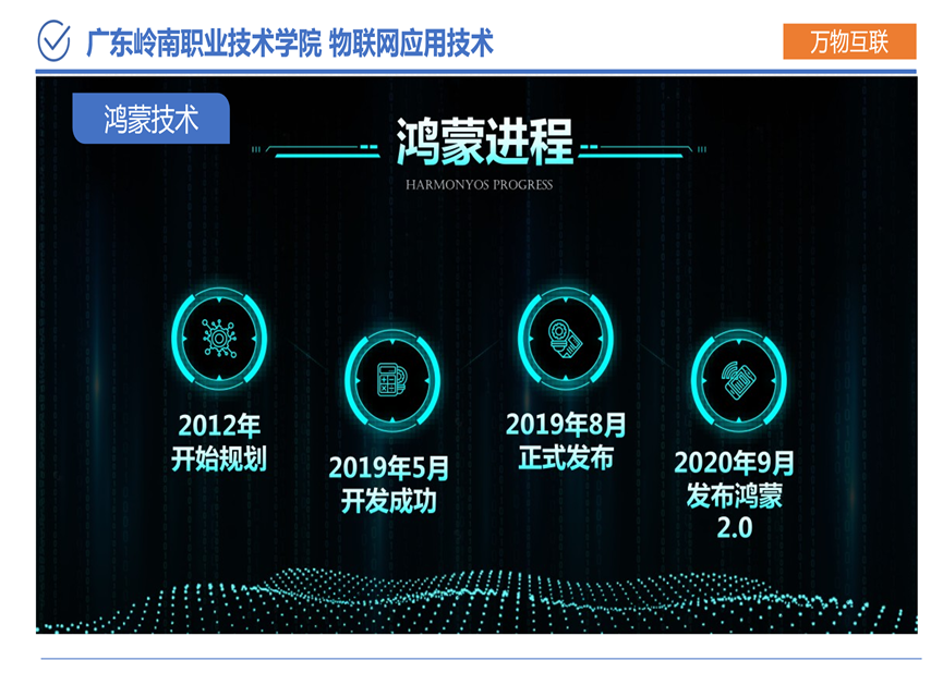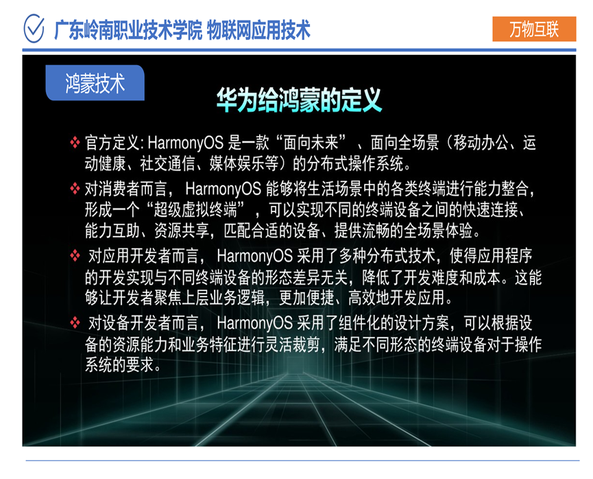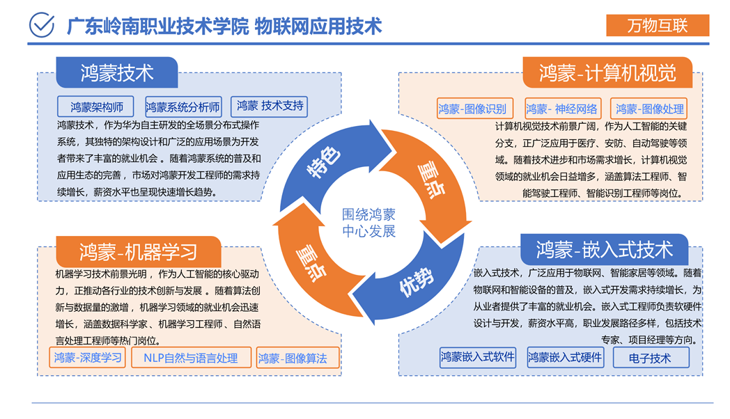 广东岭南职业技术学院-物联网应用技术专业以鸿蒙技术开发(harmony develop)为物联网应用技术专业基础特色。围绕“鸿蒙”基础特色,大力发展面向鸿蒙-计算机视觉应用技术、鸿蒙-机器学习、鸿蒙-嵌入式技术的” 鸿蒙应用型人才”。