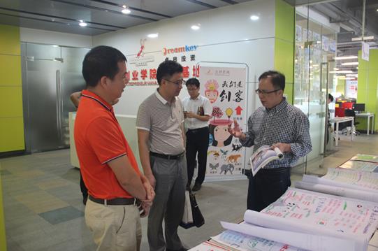 东莞市轻工业学校与华南职业技术学校代表一行莅临科技中心C座4楼,首先参观了由陈宏老师及中小企业创业与经营专业教师队伍共同编著的情景化可视化创新创业系列特色教材,陈宏老师向各位来访领导介绍了这一系列教材的特色之处、使用意义及方法。陈宏老师指出“从前老师是课堂的主宰者,课堂的表现形式多为讲课、提问、作业和考试,学生被迫的接受学习;现代教育应该把学习的主动权交还给学生,用翻转课堂、团队任务等方式让学生主动的参与进来,真正做到老师是学生学习的引导者和促进者。”这段话引起在场所有参观交流客人的共鸣。