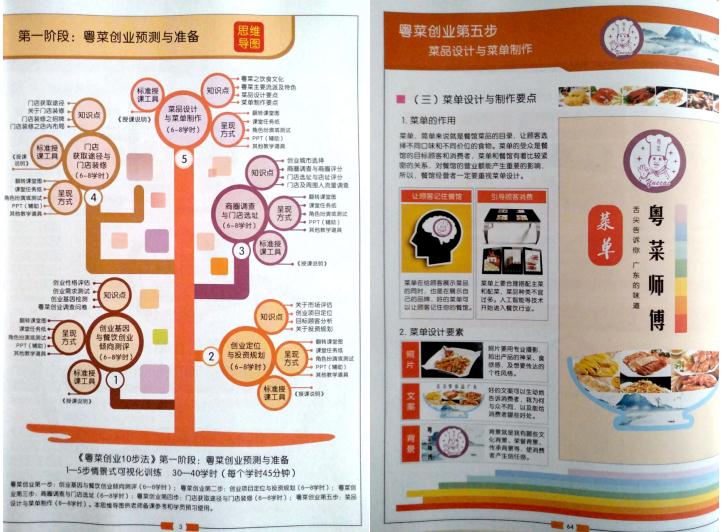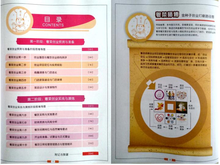 《粤菜创业10步法》是专门指导如何指导粤菜开店(特别是小微创业、扶贫创业)的专门化教材,与“粤菜师傅”系列烹饪技能培训相配套。《粤菜创业10步法》的教学结构分为“粤菜创业预测与准备”和“粤菜创业实战与演练”两个阶段,在第一阶段“粤菜创业预测与准备”中包含:“创业基因与餐饮倾向测评”、“创业项目定位与投资规划”、“商圈调查与门店选址”、“门店获取途径与门店装修”、“菜品设计与菜单制作”五个步骤;在第二阶段“粤菜创业实战与演练”中包含:“餐饮采购与实施要点”、“财务预测与风险分析”、“餐饮招聘岗位与店员辅导要点”、“开业前准备、试营业与正式营业”、“餐饮日常经营管理要点与管理循环”五个步骤。