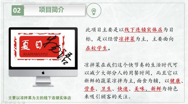 此项目主要是以线下连锁实体店为依托,是以经营家乡凉拌菜为主,主要面向在校学生等群体,商业街、工厂附近的人群。
