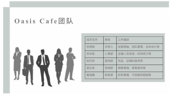 我们团队五人都为酒店管理专业的学生,彼此都较为熟悉,减少了磨合期,很快便进入工作状态。专业课程的学习,使得我们在咖啡方面的知识储备有余。准备项目的过程中,我们有灵感迸发的时候,也有才思枯竭的时候,为了一个新的想法欢声雀跃,也会在同一个点子上各执一词。团队每个人都有自己的经验阅历和个性特征,每一次讨论,都为这个项目创造更多可能性。大家都在为了Oasis Cafe项目而努力,想尽全力把Oasis Cafe项目做到最好最优。而这个项目也离不开老师的悉心指导,他们竭尽所能地帮我们更深入地了解“互联网+”和“创新创业”这两个词的含义,使得我们能够在项目上尽善尽美。