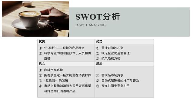 我们团队此前没有参加过创新创业类的比赛。起初,如何创新?如何做到独特?如何脱颖而出?三个“如何”使我们冥思苦想了好几个夜晚。最终我们决定,不再以一个创业者的身份去完成这个项目,而是回归学生的身份去看待。因为这个项目的主要客源是学生,店面选址也定在校园内。只有学生才了解学生需要什么。于是最后我们敲定了“饮用咖啡新风尚,咖啡文化新体验”的品牌理念,并选择在“小绿杯”上下足功夫,以宣传作为牵头,引伸出一系列Oasis Cafe项目的闪光点。