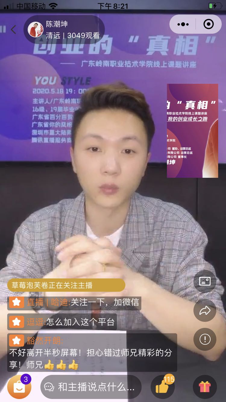 在直播间里,潮坤师兄以自己的创业成长经历从如何在岭南的创业摇篮中成功0起点创业,如何走出创业低谷、如何转化社会资源,如何抓住创业机会,如何打造创业团队等多个方面与三千多名师弟师妹进行了分享!