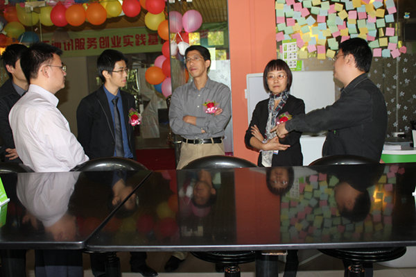 校企双方在创业基地进行亲切交谈(左二杨子龙总经理,左三王振光副主任,右二李旭穗院长)