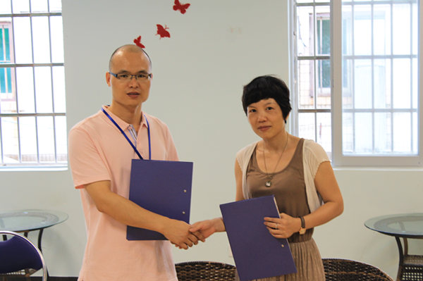 广州市大同社会工作服务中心董向阳主任(左)、管理学院人力资源教研室倪春丽主任(右)进行签约仪式
