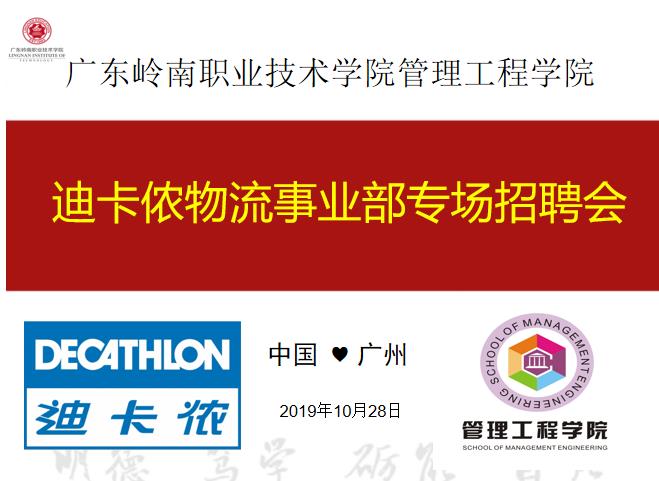 10月28日,管理工程学院物流管理专业邀请校企合作单位法国知名企业迪卡侬集团物流事业部来校开展专场招聘活动。迪卡侬物流部曾国良经理,招聘部杨伊珺经理,管理工程学院翟树芹院长,物流管理专业陈松燔主任,李耿丽老师,17物流管理1-2班合计120人共同参加了本次活动。