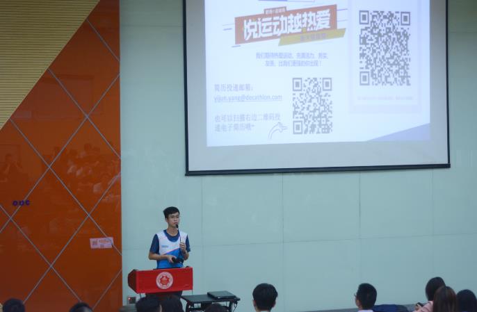 图3 迪卡侬曾国良经理为学生进行企业介绍及大会宣讲