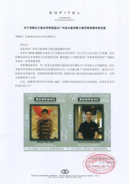 2019年11月22日,接广州圣丰索菲特大酒店的发函,在酒店实习的2017级酒店管理1班吴琳、王琼杰同学,由于其个人突出的工作表现、良好的服务意识以及精湛的专业技能水平,顺利通过了圣丰索菲特大酒店秋季“青苗领导者项目”的面试并成为一名青苗领导者。