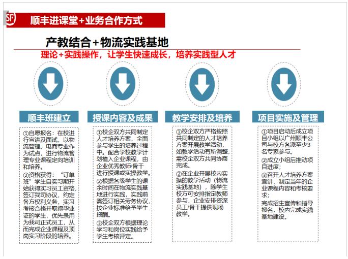 广州顺丰速运钟镇禧经理从实践场地进校园共建校内实训教学基地、结合学校课程及教学计划导入培训课程、设置平台发展特色业务服务这三个方面进行了详细的介绍,并表示广州顺丰速运希望与学院进行多元合作,打造集校园物流整合、校园教学实践基地及校园商流平台合作等功能于一体的多功能快递物流中心,创建智慧平安校园,促进人才培养、创新产业发展,教育链、人才链、产业链、创新链的有机衔接。