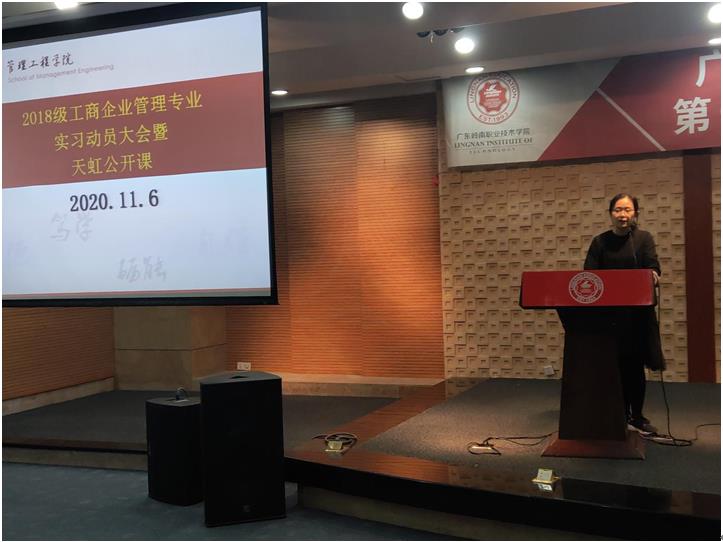 11月6日上午,管理工程学院工商企业管理专业在图书馆5楼报告厅举行2018级实习动员大会暨天虹公开课。天虹商场股份有限公司校企合作项目总监李慧女士,天虹商场股份有限公司资深人力资源经理吴久红女士出席会议,工商企业管理专业教研室林青主任主持会议,教研室教师代表和全体工商班学生参加了本次会议。