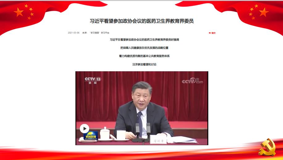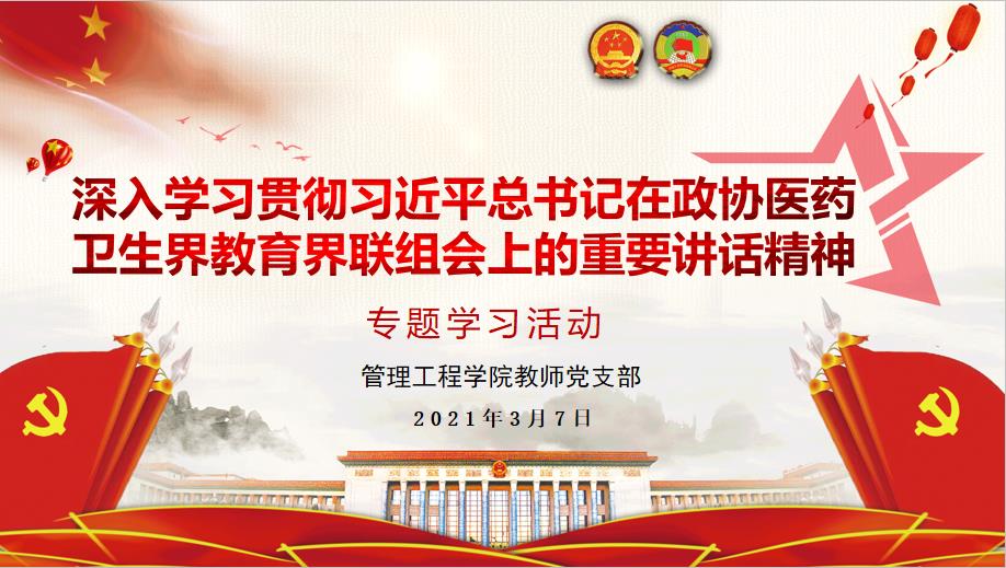 3月6日,中共中央总书记、国家主席、中央军委主席习近平看望参加全国政协十三届四次会议的医药卫生界、教育界委员,参加联组会并发表关于教育工作的重要讲话。在管理工程学院教师党支部教师中引起强烈反响。