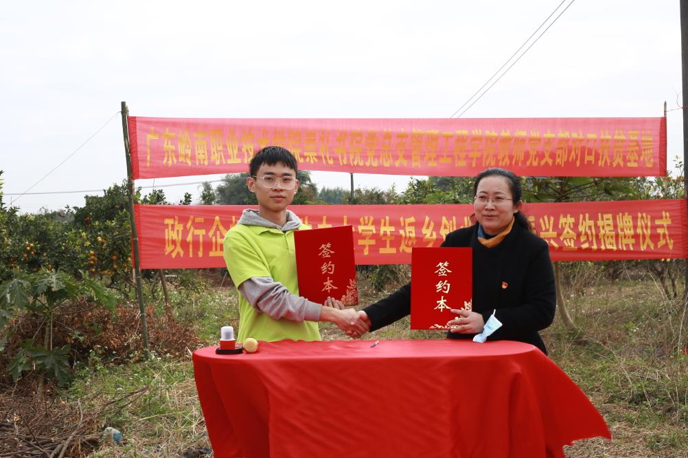 活动伊始,管理工程学院教师党支部翟树芹书记、崇礼书院总支李燕副书记、恩平市东成镇上绵湖村支部代表、“5+3”创业团队队长云锋农场负责人吴迪豪同学共同为本次活动所在地云峰农场举行“广东岭南职业技术学院管理工程学院教师支部对口扶贫基地”、“广东岭南职业技术学院管理工程学院5+3双创项目实战基地”、“广东岭南职业技术学院管理工程学院乡村振兴新媒体营销人才培养基地”揭牌和战略合作协议签字仪式。