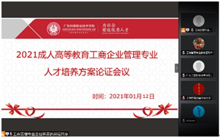 2021年1月12日晚20:00-21:00,工商企业管理专业通过腾讯线上会议,召开了一场简洁、高效、务实的“2021成人高等教育工商企业管理专业人才培养方案论证会”。此次论证会议邀请了佛山职业技术学院、广东工贸职业技术学院、广东科技学院等兄弟院校的工商专业的教授和沃尔玛、天虹等知名企业的资深经理人,以及本专业的老师和学生代表共同参与。
