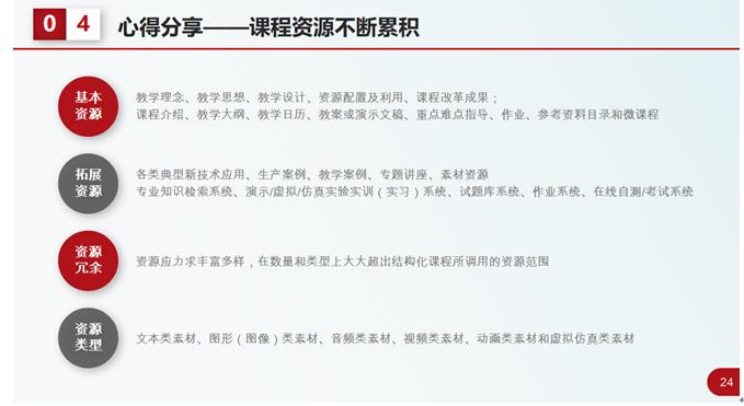 从金老师的本次经验分享中可以发现:在精品课程建设过程中,要充分了解精品课程建设改革在未来的趋势,熟悉目前精品课程建设的现状以及课程建设的各项文件,理解文件精神,结合热点按评分指标准备建设过程中需要的资料。精品课程建设是一个漫长的路,建设初期的课程确定,平台的选择,团队的组建,以及课程的教学设计和后续知识的优化,每一步都需要用严谨的态度去开展,不断的积累与之相关的课程资源,尽己所能的去完善每一门课程。